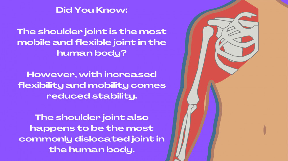 Did You Know:  The shoulder joint is the most mobile and flexible joint in the human body? However, with increased flexibility and mobility comes reduced stability. The shoulder joint also happens to be the most commonly dislocated joint in the human body.